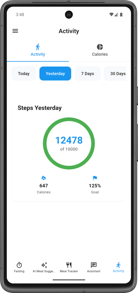 The real value is seeing patterns over time. Do you move more on fasting days? Less? Does hitting your step goal correlate with better sleep, easier fasts, or more consistent eating? Your data will show you what works for YOUR body.