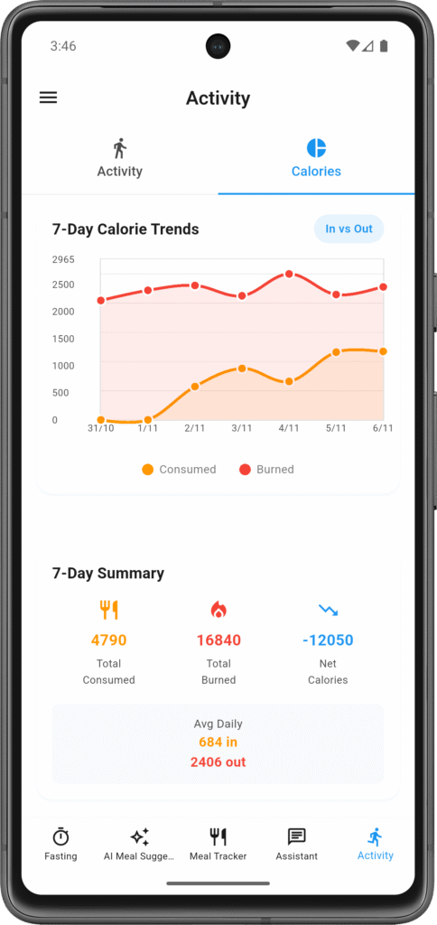 If you’re fasting, seeing your calorie burn can help you understand your deficit. You’re not eating (0 calories in) and you’ve burned 350 calories from 8,000 steps plus your BMR—that’s a real energy deficit you can actually quantify.